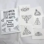 Each pattern is printed on a water-soluble sticker. You unpeel and stick the moth transfer wherever you want to embroider the image. Embroider as you would normally, using the transfer as a guide you stitch into. Once the embroidery is finished, rinse off the transfer in the sink. Let it dry, it's really that easy!